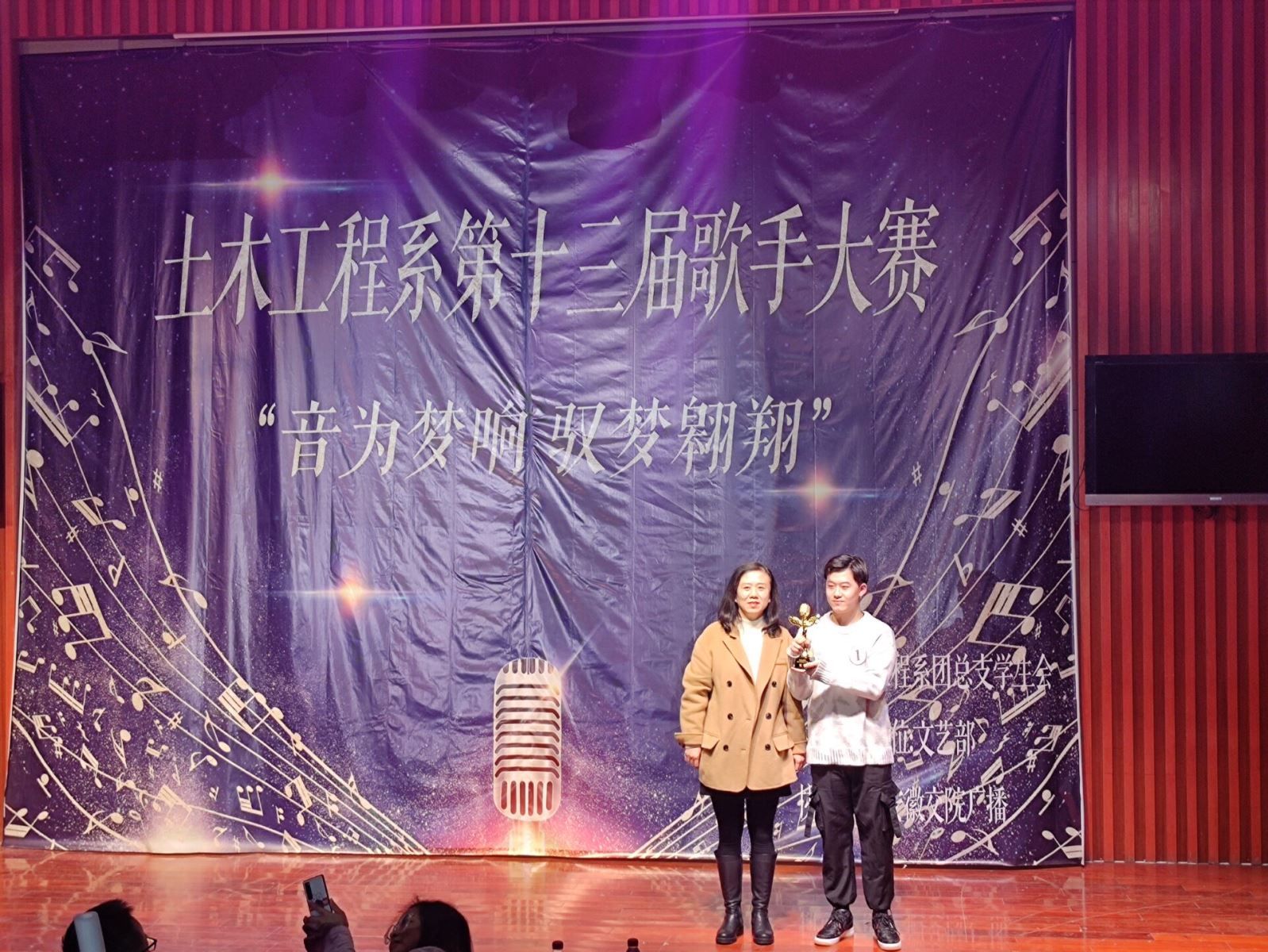 11月30日晚,由土木工程系团总支学生会主办、土木工程系文艺部承办、安徽交院广播协办的第十三届歌手大赛在北区八角楼举行。比赛在文艺部女生青春洋溢的串烧舞蹈中开场。经过三轮激烈的比赛环节,以及三位专业评委老师综合评比之后,1号选手金凯同学最终斩获冠军,土木工程系党总支副书记朱蓉老师为其颁发了象征着荣誉的冠军奖杯。最后,由十三位参赛选手深情演唱的《那些你很冒险的梦》,引发了全场大合唱,比赛至此圆满结束。