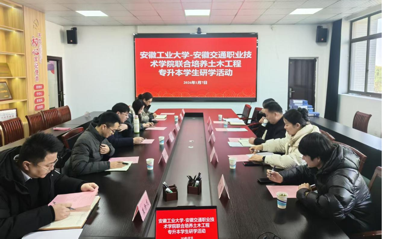 为深化校际协同育人,提升土木工程(专升本)专业联合培养质量,1月7日上午,土木建筑学院副院长纪凯一行,带领2025级土木工程(联合培养)全体学生,赴安徽工业大学建筑工程学院联合开展研学交流活动。安徽工业大学建筑工程学院党委书记张虎、副院长吕忠、方圆及骨干教师出席活动。