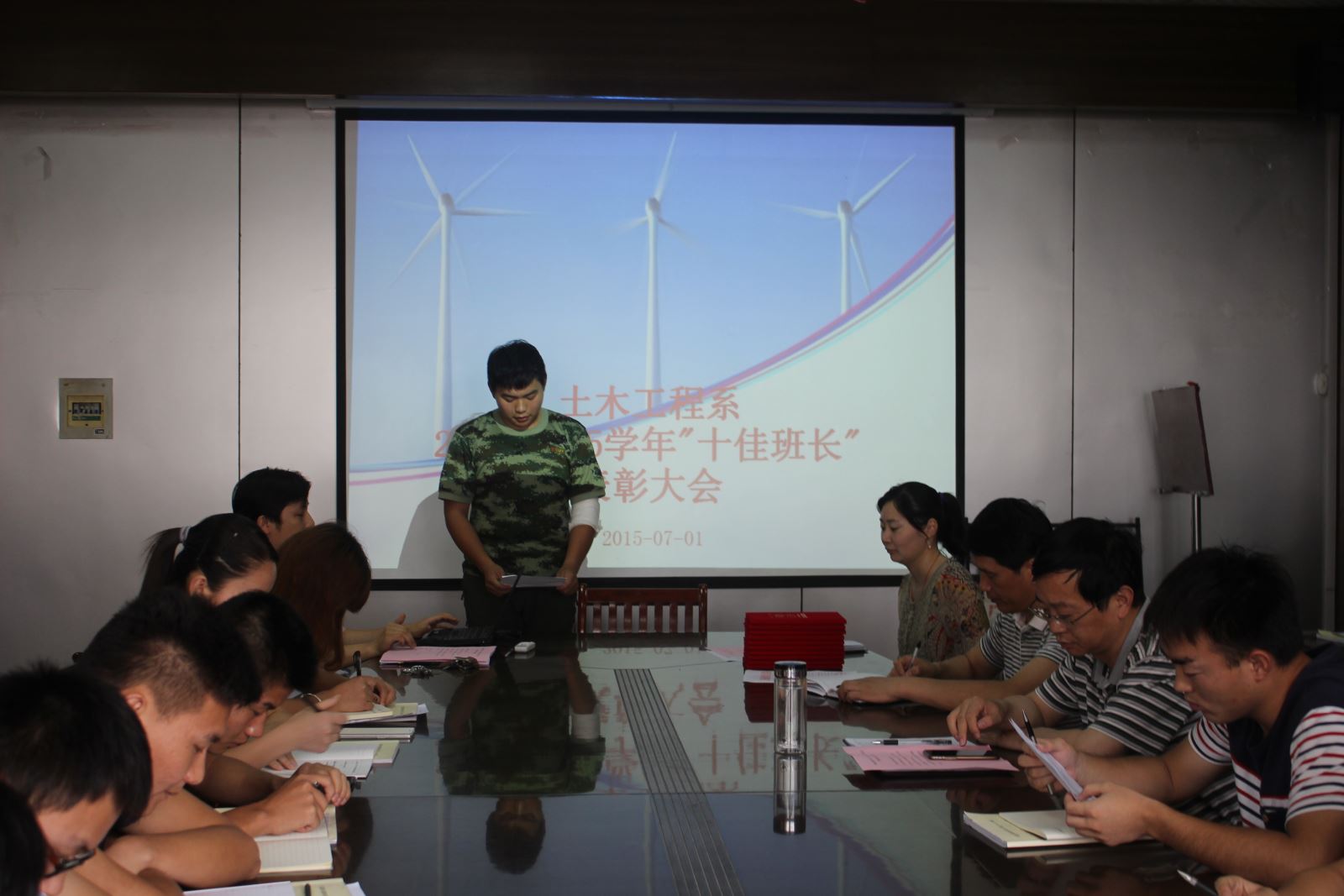 2015年7月1日下午四点半,土木工程系在会议室召开了2014-2015学年“十佳班长”表彰大会暨期末班长例会。系党总支朱文胜书记、陶权副书记、系教学秘书郭强老师、系主任辅导员赵婧老师以及13、14级各班长参加了会议,会议由赵婧老师主持。