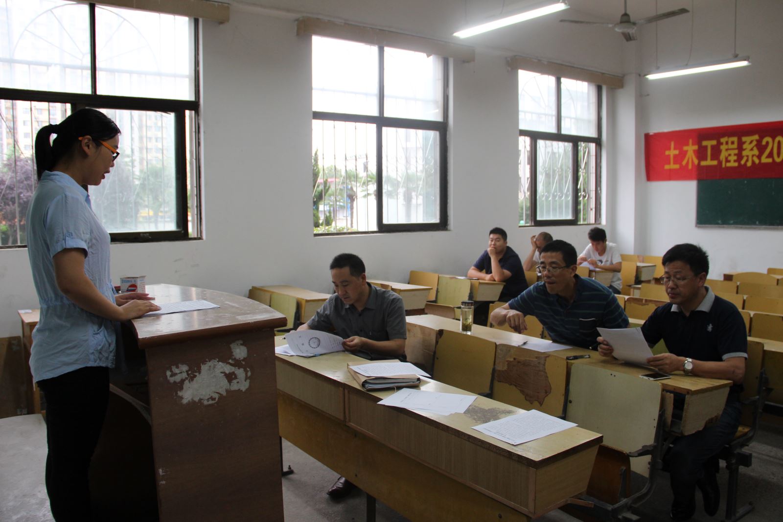 2015年6月26日,土木工程系2015届毕业答辩在教学楼顺利进行。本次答辩分为五个答辩组,分别由道路与铁道工程教研室王守胜主任、桥梁与隧道工程教研室严任苗主任、专业基础教研室齐永生主任、造价专业带头人杨敏老师、港口与建筑工程教研室徐炬平主任负责。每个班级随机抽取的部分毕业生参加了此次毕业答辩。