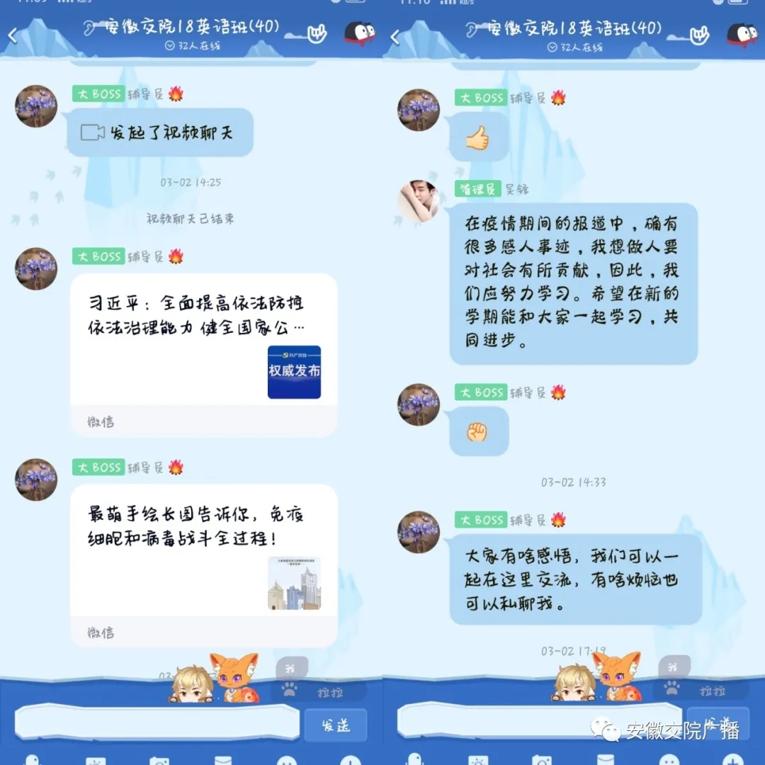 以班级QQ群等线上群组讨论形式开展,向同学们传达了我院疫情防控的文件精神和工作指示,带领同学们解读防疫形势,学习、宣传防疫知识,疏导不必要的恐慌心理。