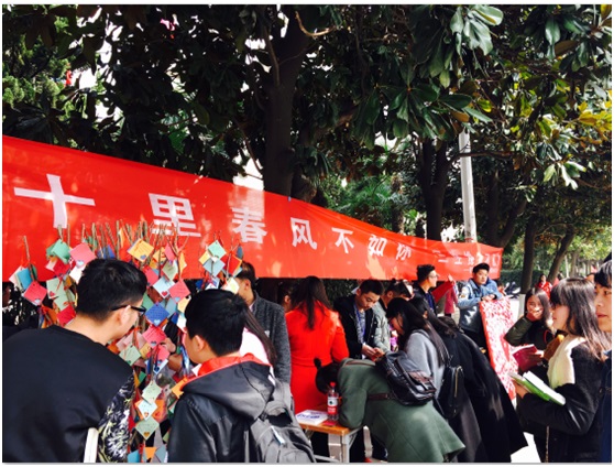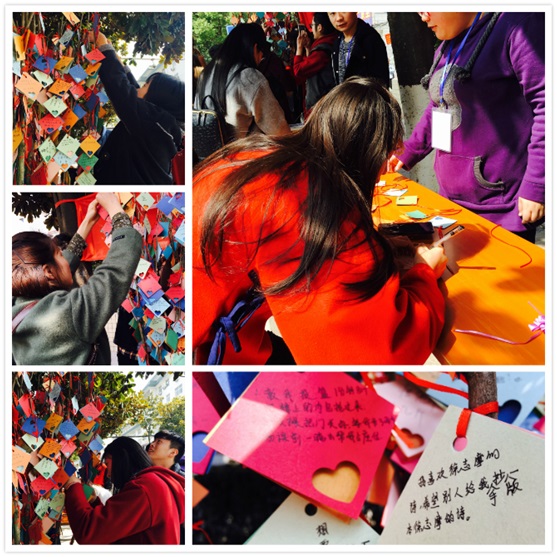 第二个活动为“女生写心愿,男生来实现”:女生在心愿卡上写下心愿、留下自己的联系方式并将心愿卡悬挂在心愿树上,愿意帮她实现愿望的男生可将心愿卡摘下、获取女生的联系方式并帮助她们实现心愿。在活动现场,女生们纷纷写下心愿、期待有男生来到现场摘下自己的心愿卡。