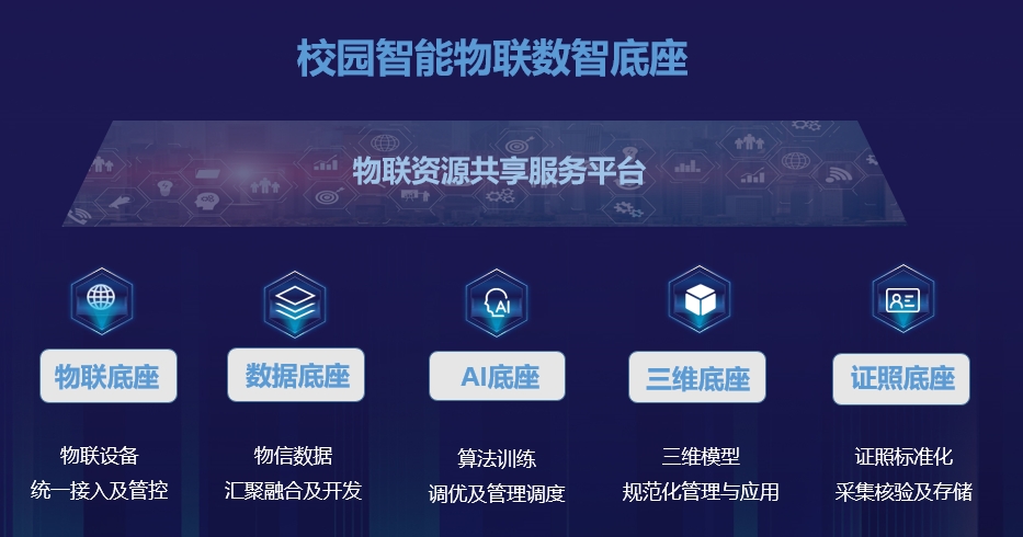 校园内物联设备多、分布广,且系统复杂多样,这对各系统间的无缝联动与数据交互提出了迫切需求。为了对所有物联设备进行标准化、统一化的接入、管理,同时实现物联资源的共建共享,学校打造了一整套完善的标准规约体系,并构建了一个智能物联底座,旨在通过物联接入、智能算法、数据分析、三维建模和身份认证五大核心能力,推动系统间的数据资源共享与协同工作,从而提高校园的数字化管理水平。