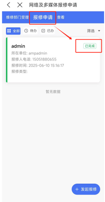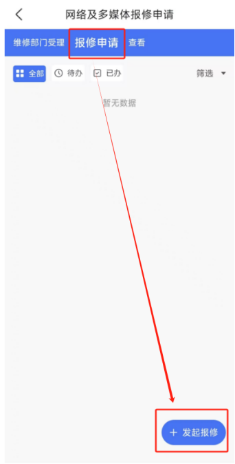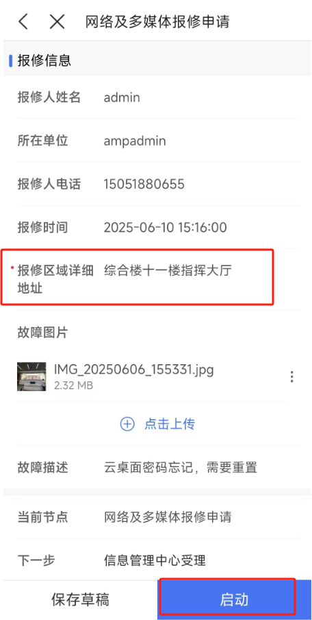 二、【报修申请】页面----点击【发起报修】按钮----填写【报修区域详细地址(必填)】、故障图片(选填)、故障描述(选填)----点击【启动】按钮