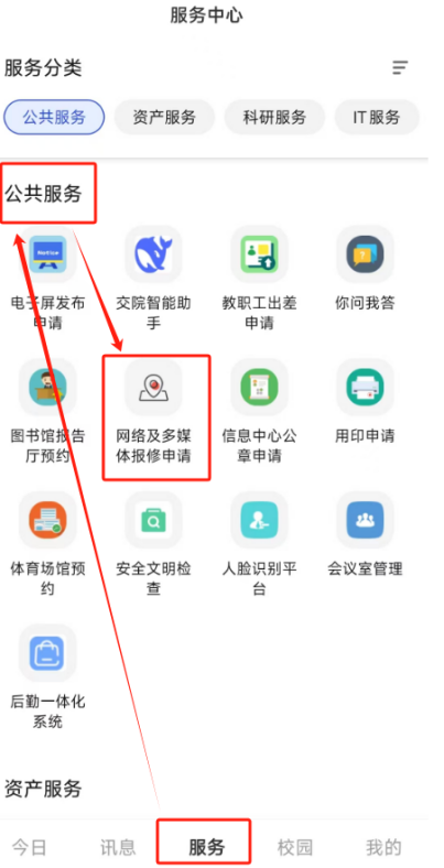 一、打开【今日校园】--点击【服务】--【公共服务】--【网络及多媒体报修申请】