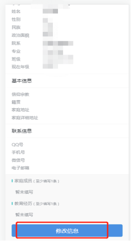 信息采集:新生须在此认真完善个人信息采集,点击修改信息开始进行信息填写,填写完成后点击提交。