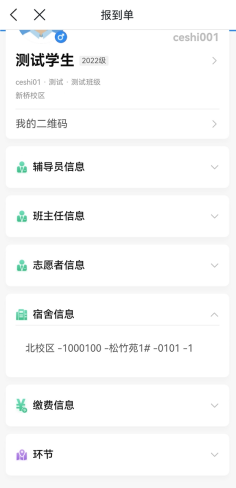 报到单:所有必办事项完成后,可以在此查看辅导员信息、志愿者信息、住宿信息、班级信息、现场报到需要的环节信息以及对应环节的办理说明。