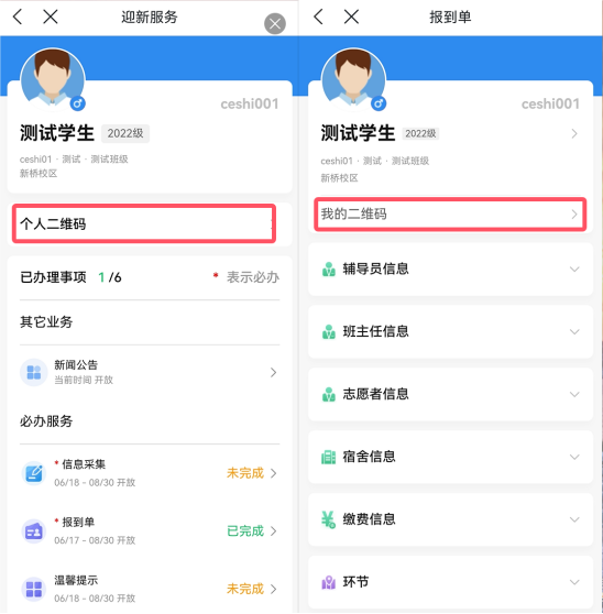 只需要将自己的二维码提供给老师进行扫描,扫完之后即完成现场报到,下面两处的二维码(迎新服务和迎新服务内的报到单)都是可以的喔~