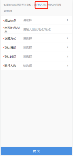 到站登记:新生可登记自己的到站信息,以及乘坐交通工具的具体情况。如因各种原因不能及时到校,需要登记无法到校的原因,方便学校安排和管理。填写完成后点击提交。