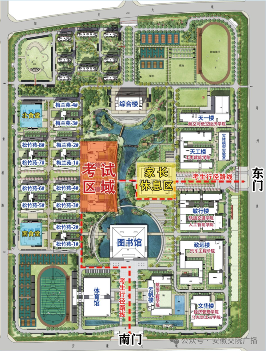 1、送考车辆可由寿州大道驶入安康大道(校园南门),或经黄楼路进入校园西北门。