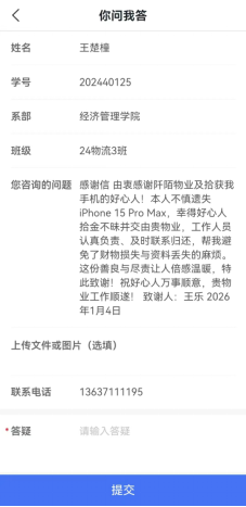 1 月 4 日,王楚橦同学通过学校“你问我答”平台提交感谢信,字里行间满是感激之情。他表示,手机内存储着大量学习资料与个人重要信息,丢失后心急如焚,抱着试一试的心态联系了校园物业。没想到物业工作人员在巡查时发现遗失的手机后,第一时间妥善保管,并通过多方渠道积极联系失主,最终物归原主。